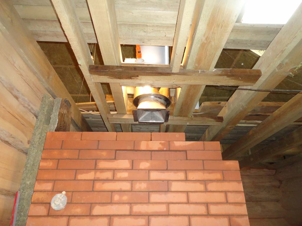 С дымоходом пришлось повозиться. Кирпичная в шестерик не входила ( расстояние между балками 480 мм.... посему пришлось воткнуть сэндвичь внутр.ф 250 мм., наружный 350 мм. , зазор между сэндвичем и балками заполнили фольгированным базальтом.