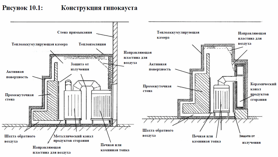 Расстояние между металлической конвективной поверхностью нагрева и защитой от излучения в гипокаусте равно расстоянию от печной или каминной топки до стен теплоаккумулирующей камеры.