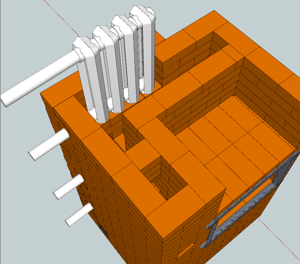 В этой печи верхний зимний горизонтальный канал аккуратненько попадает через задвижку в трубу. Резкий поворот на 90 град. вверх в трубу через задвижку меня смущает...В этом месте к тому же сходятся в одну точку зимний и летний каналы. А там еще металлическая труба из подвала. Она задумана (не мной) для улучшения тяги.
