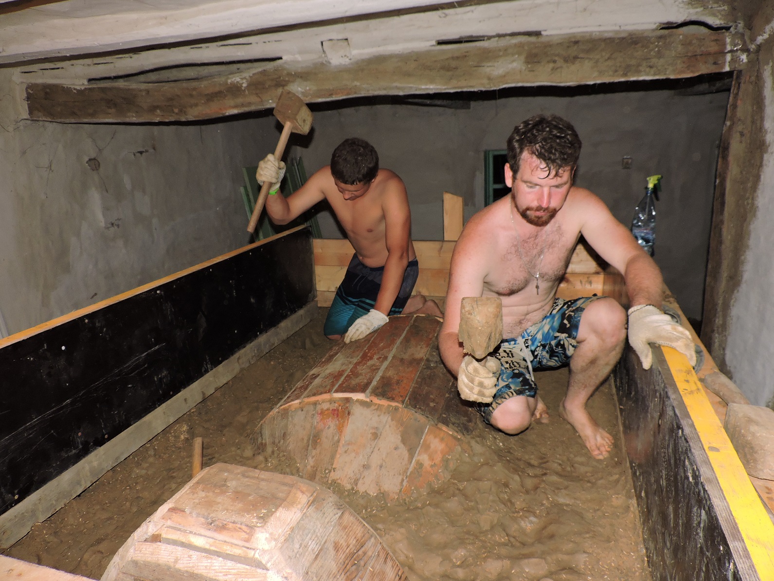Печь били несколько человек 30 часов без перерыва. В старину это это называлось помочью. Для печебития использовали деревянные трамбовки и колотушки чекмари.