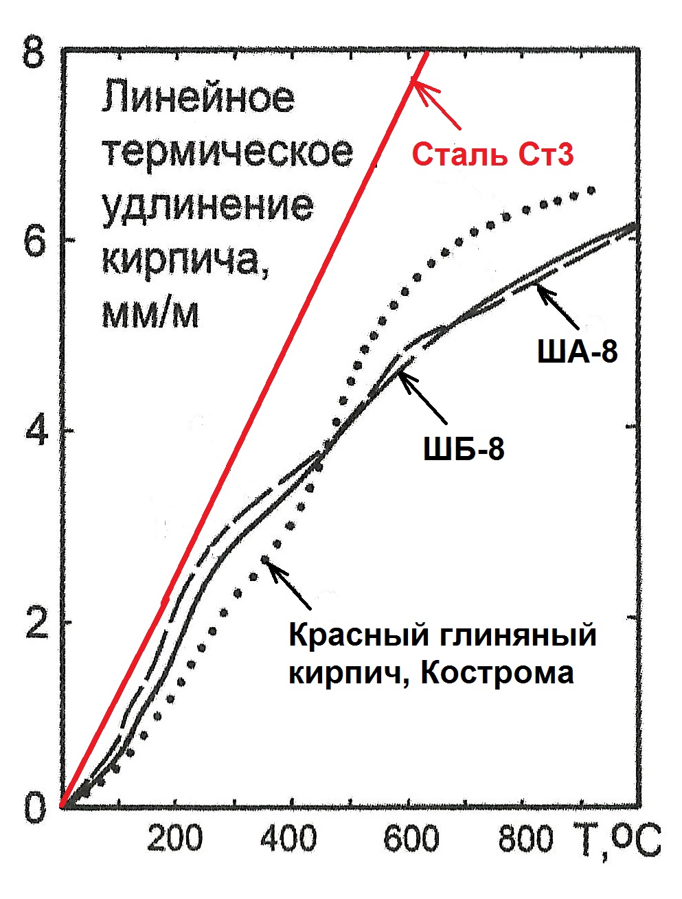 Но металл расширяется не только по горизонтальным перемычкам. Но и вверх по уголкам. То есть уголки бандажа, термически расширяясь сильнее кирпича, растягивают ядро по вертикали и рвут его по горизонтальным швам на отрыв (а это куда легче, чем сдвинуть кирпич в кладке вбок).