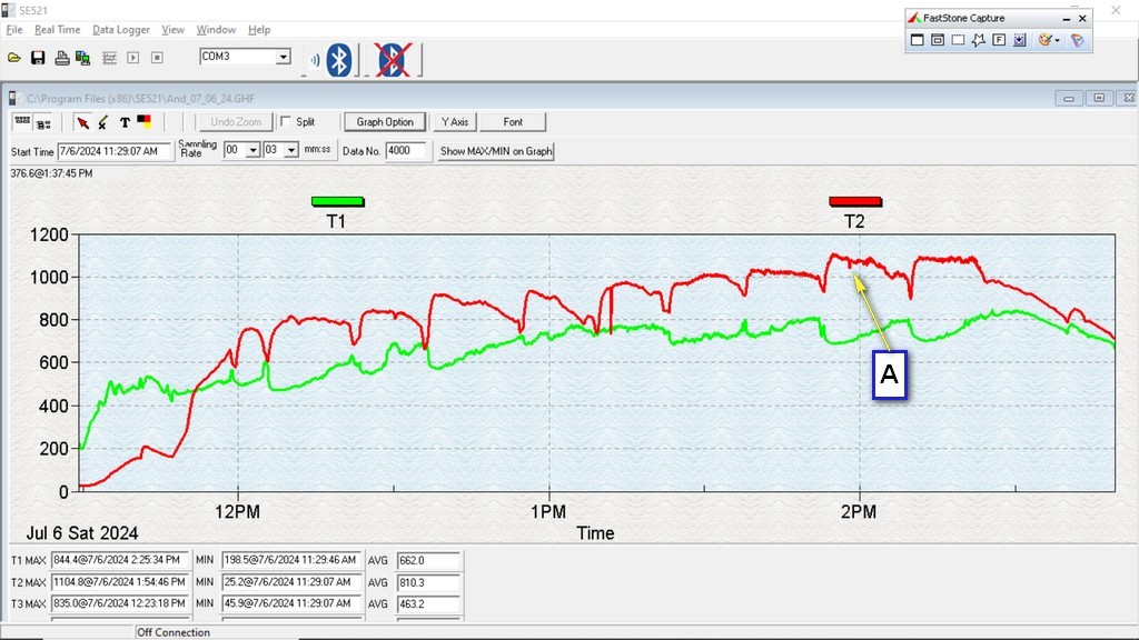 Т3 и Т4 дополнительно установленные, оставшихся не удел Трубу и Каменку вывел на второй логгер. Надежды на долгоживучесть доп. Т-пар оказались чрезвычайно завышенными: первой приказала долго жить Т4 (12:01), Т3 поспешила следом в 12:35. Начал топить в 11:30.