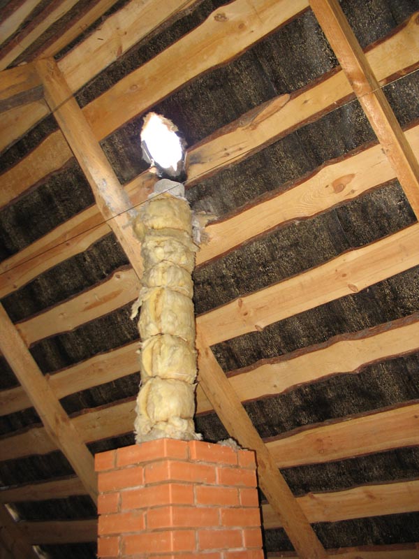 Вокруг сэндвича из нержавейки про прохождении чердака и крыши также нужно делать качественную и надёжную противопожарную разделку.