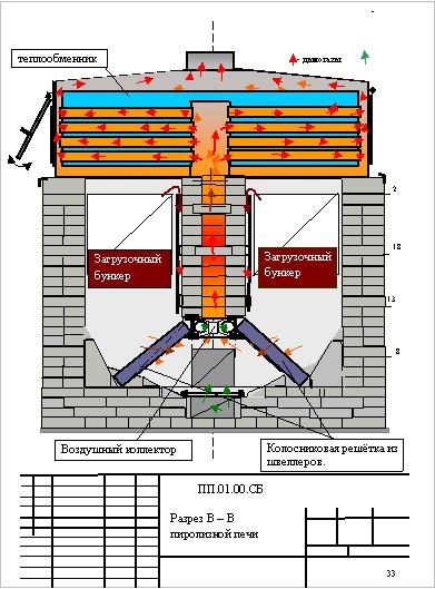 А для отопления жилых помещений есть разработка однобункерной пиролизной печи. Рисунок ниже.