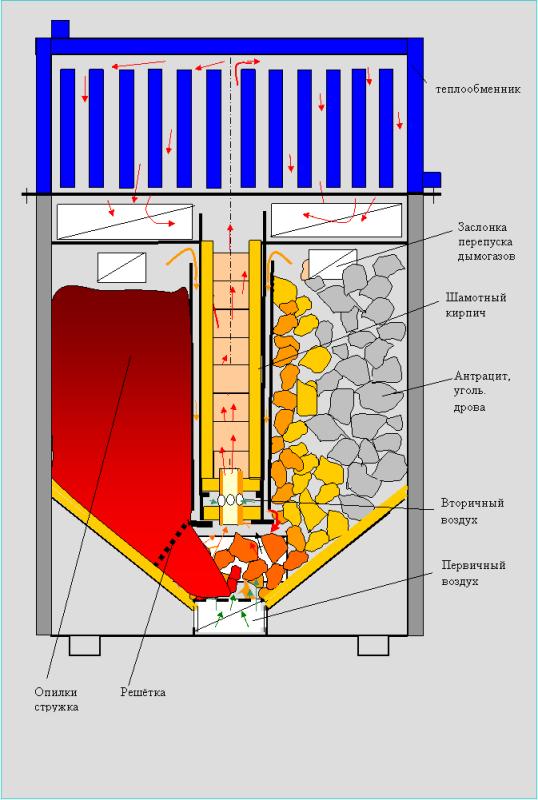 На опилках не пробовали. Но принцип сжигания опилок заложен в действующих котлах, обсуждаемых на других форумах. в т.ч. и на свежеспиленных опилках от пилорамы - в загрузочных бункерах оставляется проём, через который сверху пирогазы от опилок поступают в камеру сгорания. Колосниковые решётки обычные бытовые, из чугуна.