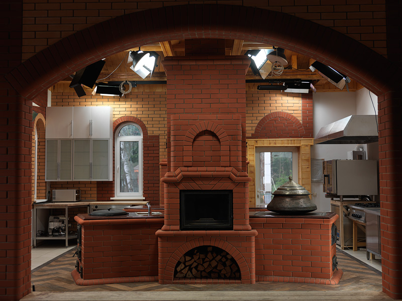 Камин здесь не несет никакой функциональной нагрузки, сделан, чтобы в кадре был живой огонь (кухня построена для теле и фотосъемок). Уровень пола помещения, откуда сделан первый снимок, выше, поэтому камин приподнят.