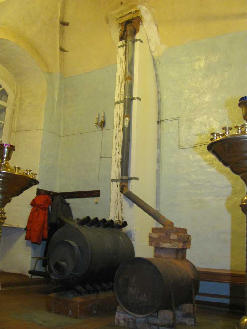 Печи были по разные стороны от входной двери, и соединялись железным дымоходом закреплённым на кронштейнах над дверью. Эстетику храма это конечно портило, но выбора не было, т. к. не хотелось пробивать ещё один дымоход в своде.