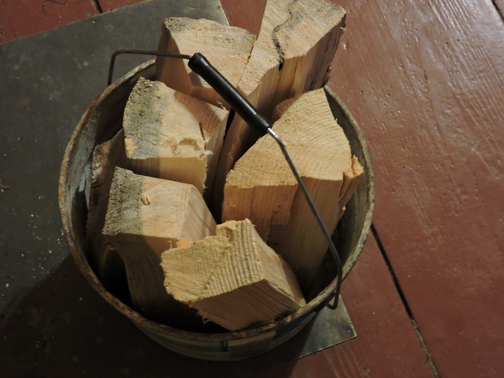 Вот столько дров у меня уходит на две печки за один раз. В ведре 4.9 кг, в связке 6.6 кг. Этого хватает, чтобы нагреть плиту до такого состояния.