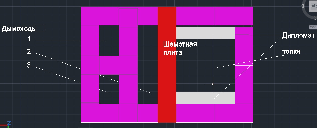 Еще с дымоходами вопрос: планировал так 2-ой дымоход из топки вверх, затем вниз в третий, затем в первый и далее в трубу. Однако не велик ли 2 дымоход, может быть разделить его на два ( 2а и 2в) . 2а будет идти вверх , затем вниз по двум параллельным ( 3 и 2в) далее в 1 и затем в трубу ? Да, каналы 1 и 2а будут соединены внизу задвижкой ( летний ход) , ну и по бокам 1 и 3 дымоходов внизу дверки для прочисток , сажу из 2-го дымохода, думаю через топочную дверку вычищать. Еще не понятно как шамотные и печные кирпичи в одном ряду уживутся? Ведь дверку топочную и вокруг нее нужно на шамотные кирпичи опирать, да и выход из дипломата в канал 2 нужно из шамотных делать, там ведь пламя будет, а сверху будут обычные кирпичи! Кладка по швам не разойдется ? Зольник не показан на рисунке, с ним, вроде как, проблем не должно возникнуть...