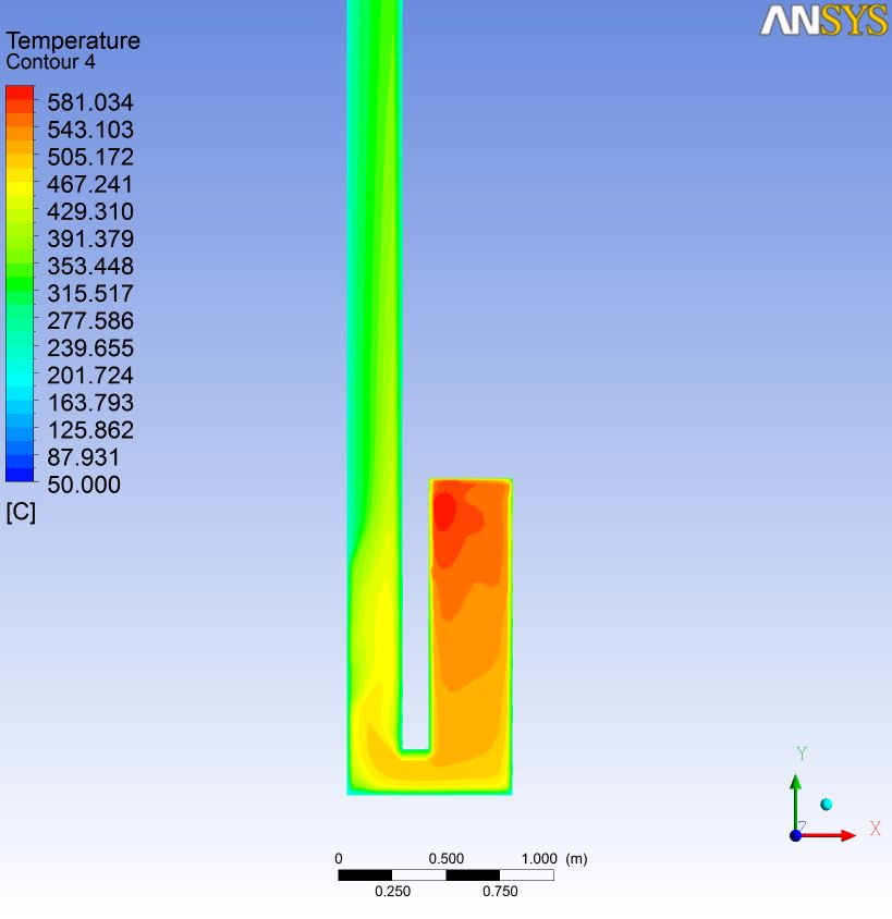 Вот, что получилось... Никаких начальных давлений в inlet и outflow не задавал, модель считалась как есть. В v. inlet указал velocity magnitude 0.5 м/с, температрура 983 К. Как вам такая картина?