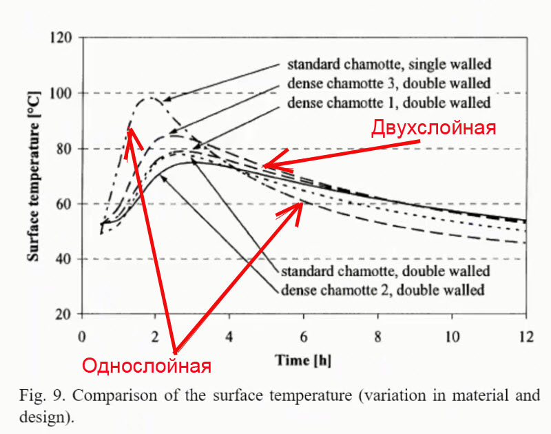 Возвращаясь к серьёзному разговору, на мой взгляд, следует заметить, что многослойность печной стенки, это прежде всего вынужденная, тенологически, мера, т.к. однослойная("монолитная") стенка, толще чем 12см, весьма нестабильна. С другой стороны, многослойность позволяет получать лучшие теплотехнические характеристики стенки и прибора в целом.