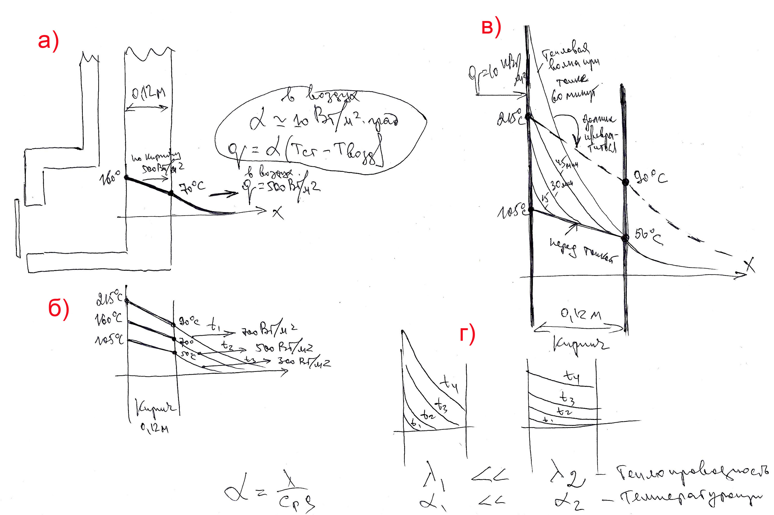 1. После "устаканивания" (в режиме охлаждения печи) тепловой поток в кирпиче должен быть равным тепловому потоку со стенки в воздух (рис.А). То есть при теплоотдаче 500 Вт/м2 температура на поверхности печи 70град, а в печи 160град.