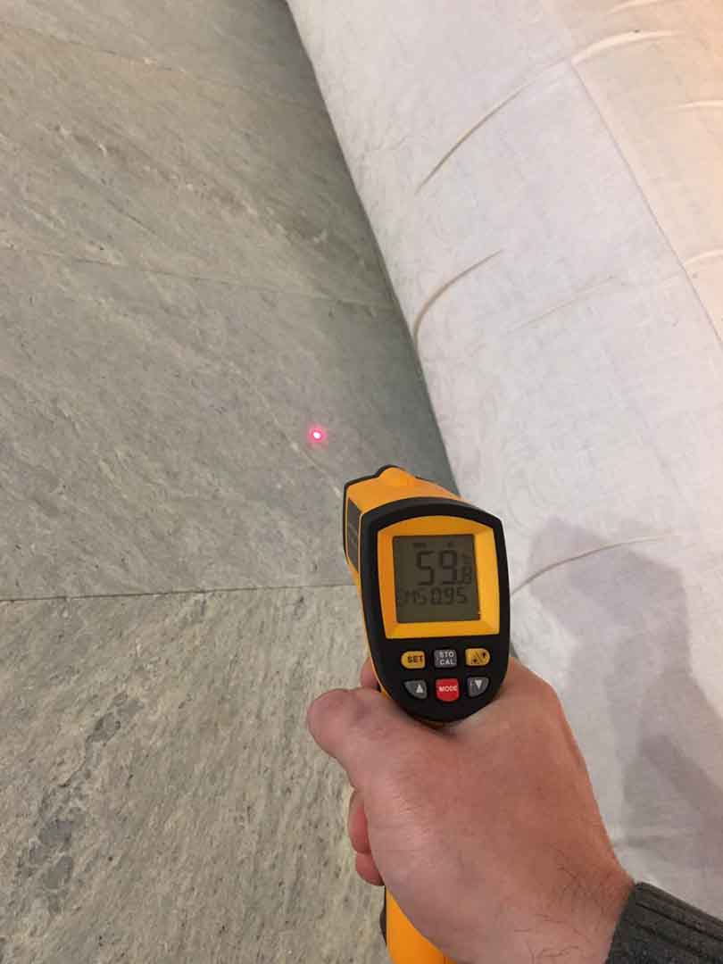 С 18-20 градусов в помещении, помещения отапливаются водяными теплыми полами, топливо-магистральный газ.