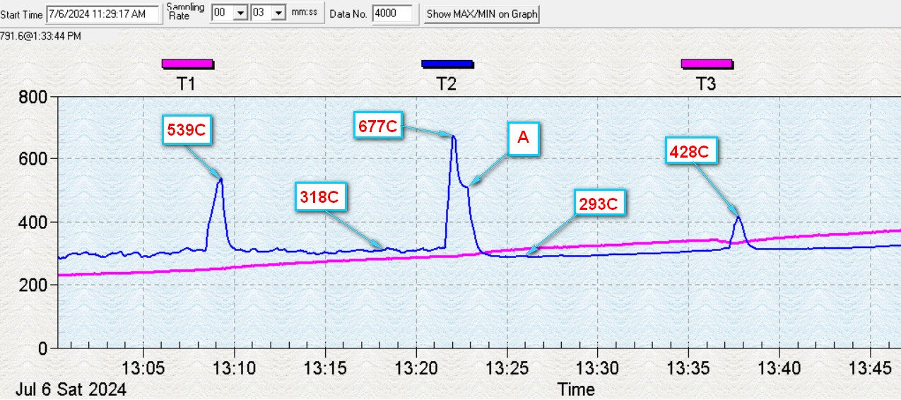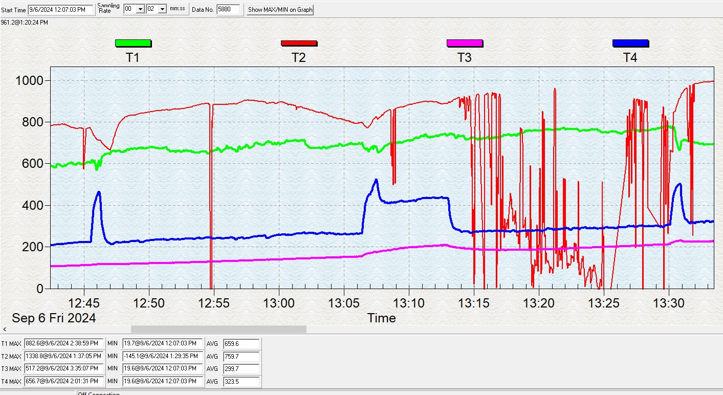 АЗ - топка печи сентябрь 06.24 Т1 - топка, цвет зеленый. Т2 - выход из Реактора, цвет красный. Т3 - каменка, цвет магента. Т4 - труба, цвет голубой. Показан неправедно открытый шибер с 13:08 по 13:14 |