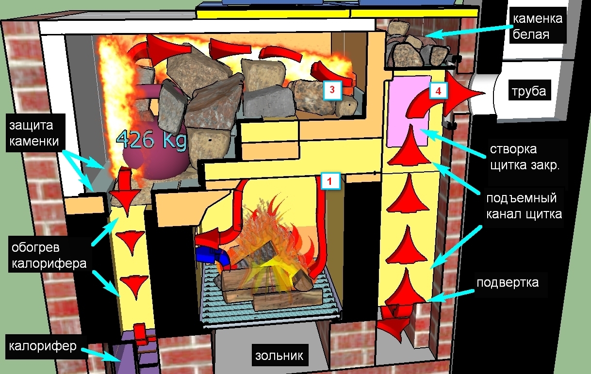 Насчёт свода – это самое горячее место печи, которое в конструкциях типа «обращёнки» доставляет массу хлопот в плане пожаробезопасности. В нашем же случае свод Топки активно работает на парообразование, нагревая закладку Каменки даже в момент обдува её «холодным» воздухом ВВ и поддувала.