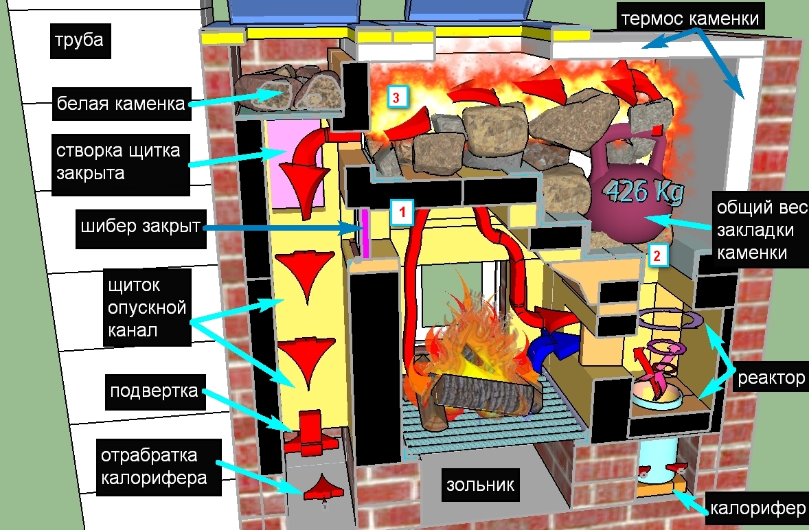 | При открытой ЗПХ появляется свирепая тяга и общее количество прогоняемого воздуха через печь значительно возрастает, в том числе и через камни, что приводит к более шустрому прогреву закладки. |