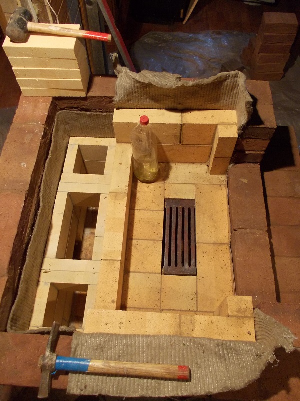 С внутряннкой футеровкой каналов -колпаков немного разобрался .Два опускных по 14 см один подъемный 26 см прокладка между кирпичем базальт картон 5 мм. Огнеупорная смесь для топливника взял смесь Мертель теракот 25 кг лещадку сажаю на мастику Универсал.