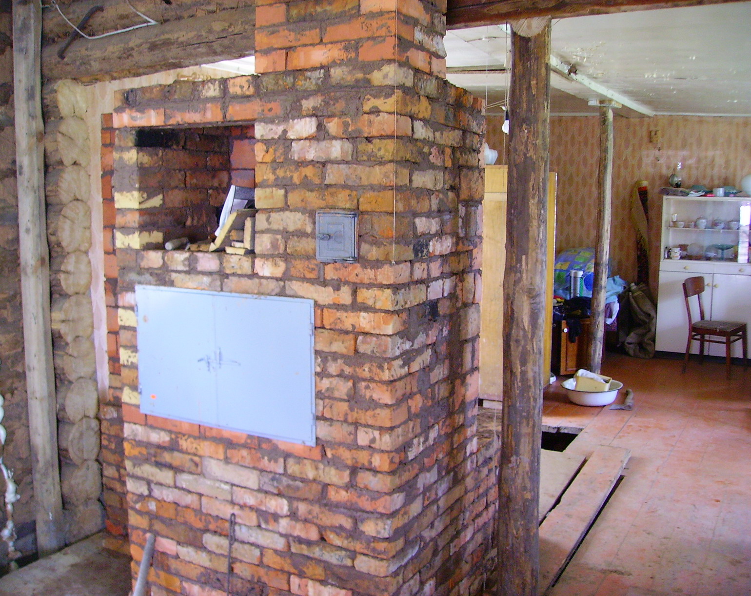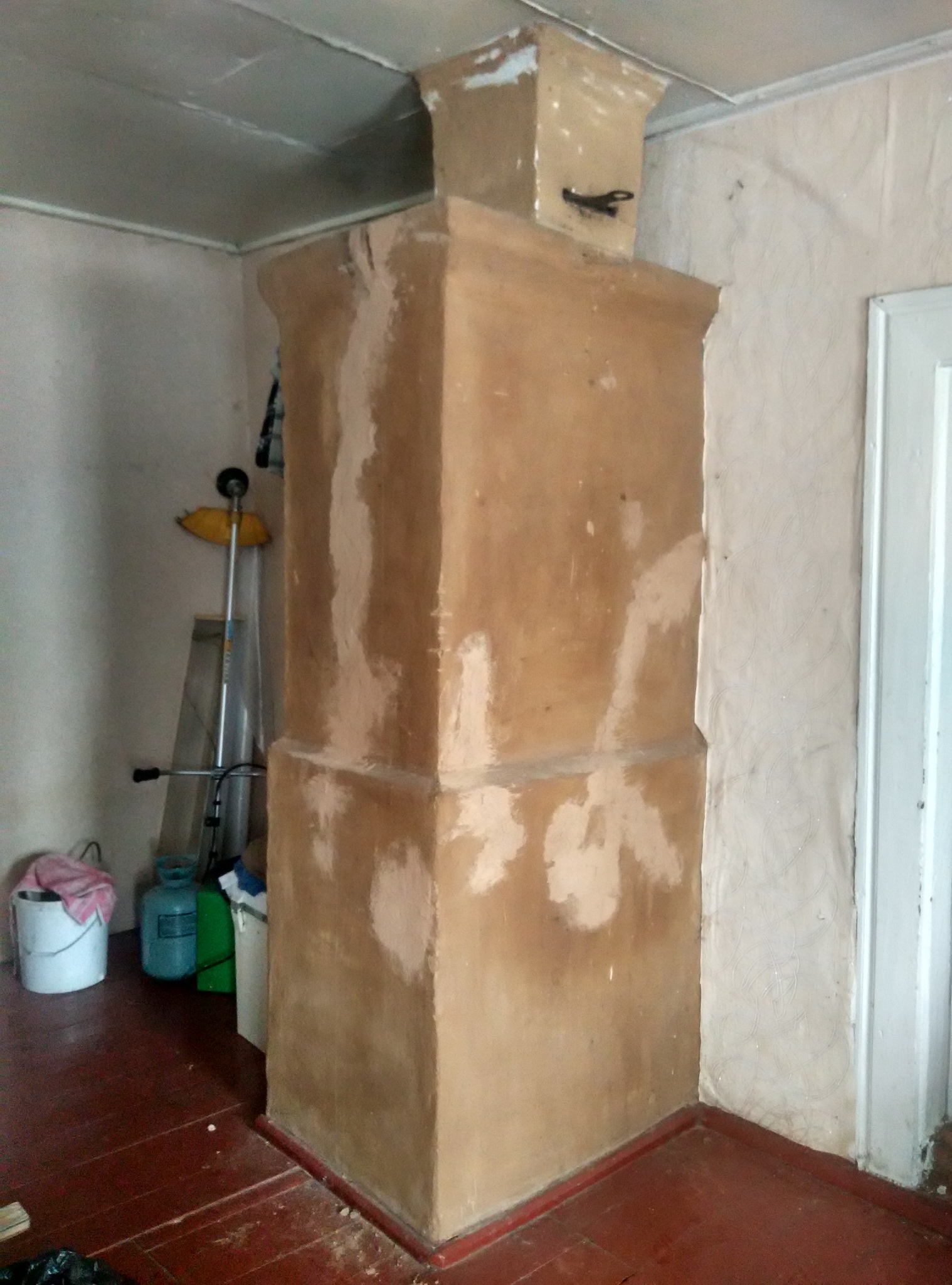 Изначально в этом месте уже стоит печь - фото прилагаю и прошу прощения за бардак на фото. Дом недавно куплен и еще приводится в порядок. Печь будет разбираться. В комнате 20 кв.м. стоит русская с отопительным щитком. Пользуемся только щитком - русская треснула и дымит.