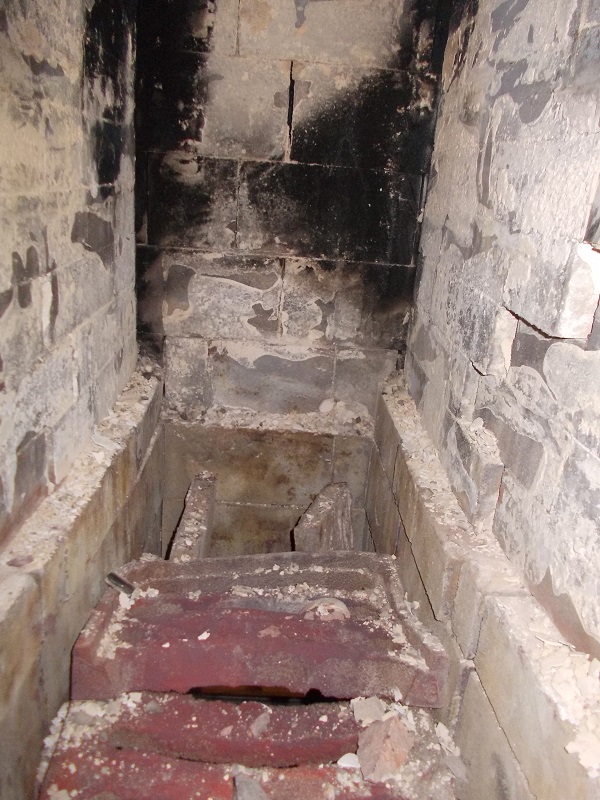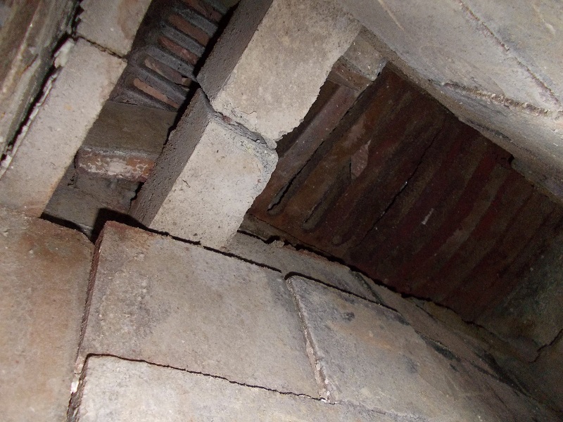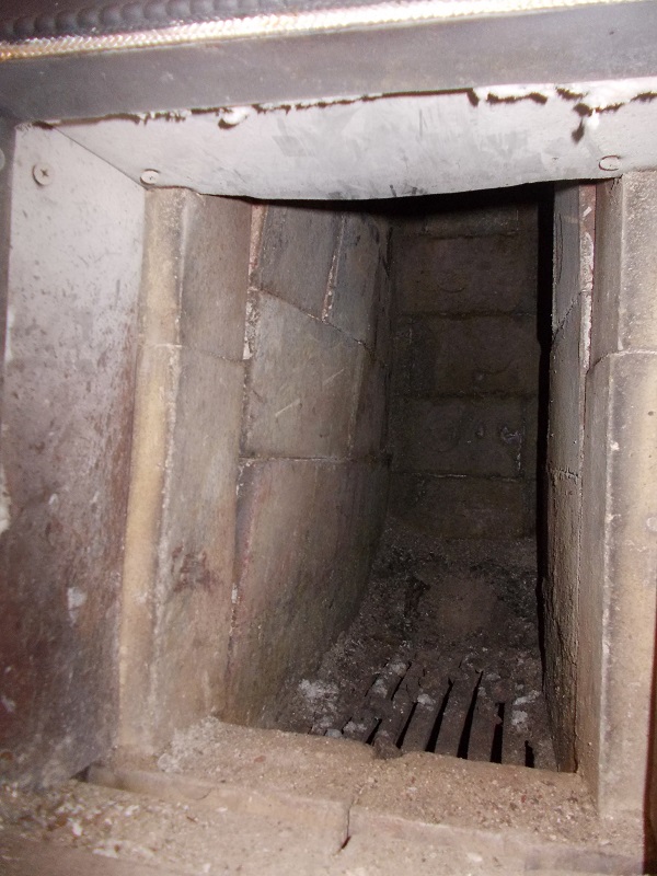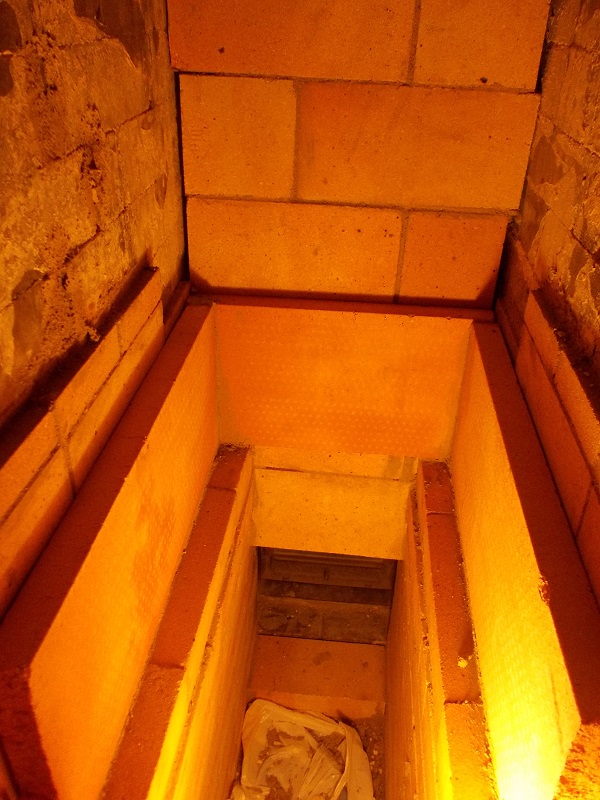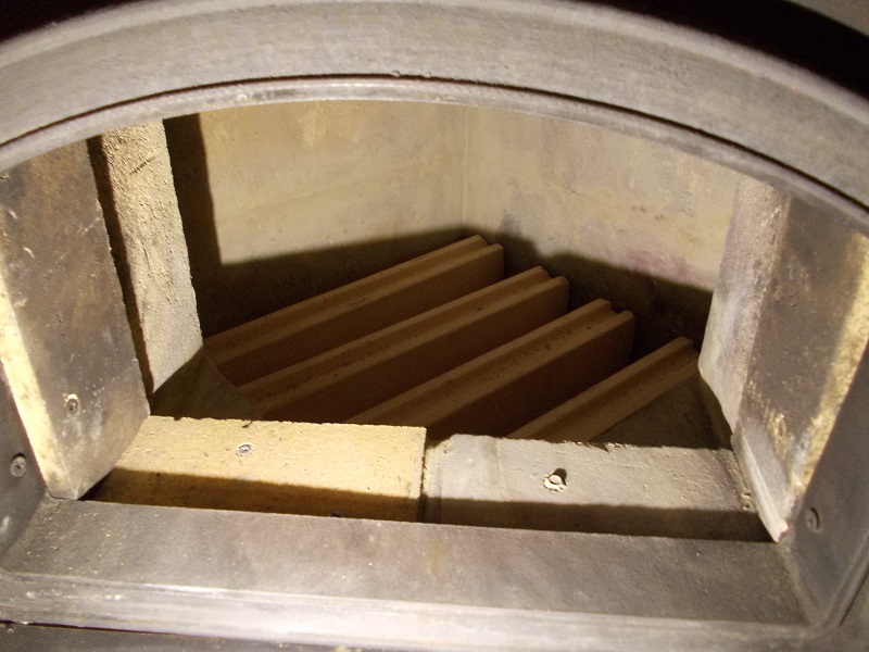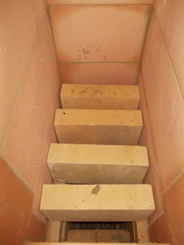 Алексей стенки выперло потому что на футеровке стоит каменная закладка -не сняты весовые нагрузки на футеровку. Вот ниже фото -печь построена в 2012 г. -балочки рассекатели оплавились раскрошились частично и высыпались в топку.Стенки топки целые и их не выперло. Что интересно отверстия для вторички были треугольными -стали круглыми и оплавленными. Значит вторичка работает прекрасно-виден вокруг отверстий оплавленный шамот. Также прекрасно видно и оплавленные рассекатели и это шамот марки ША.