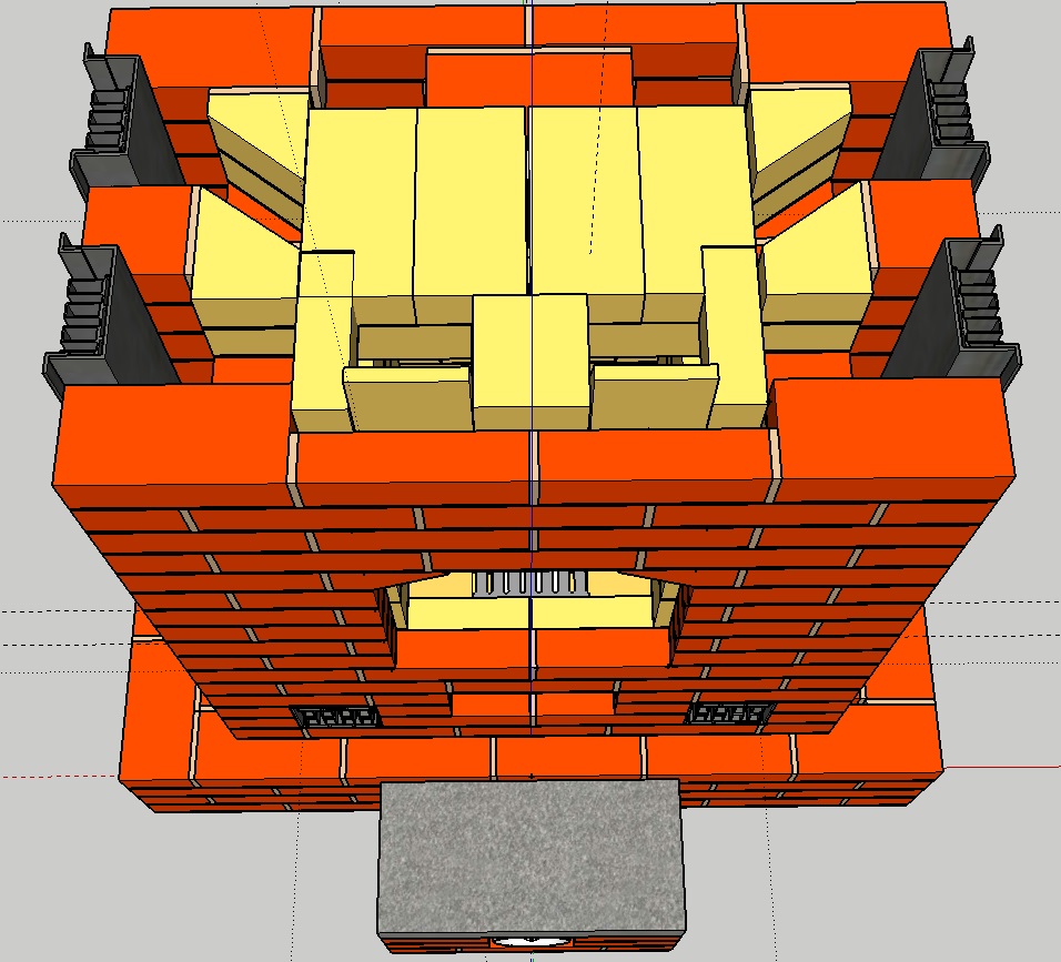 Центральный топливник футерован шамотом на ребро и имеет выходы в два боковых по 14 опускных канала с каждой стороны до уровня пола. Общая площадь опускных 1 кирпич. и далее с выходом в два подъемных . Так же топливник имеет фронтальный выход вверх для организации канала летнего хода и режима камина. Опускные каналы соединяются на уровне пола и после подверки подают дымовые газы в два подъемных канала 12 кирпича. Каналы имеют балансировочный горизонтальный канал. ДГ поступают в на второй ярус печи в два небольших боковых колпака из которых уже поступают в основной канал дымовой трубы.