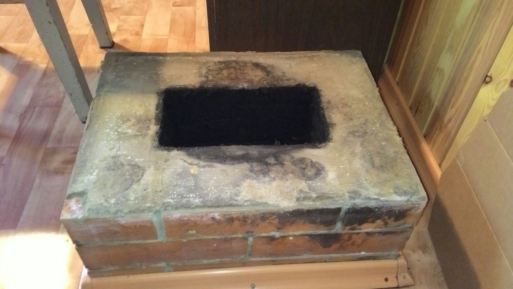Наконец-то добрались до трубы. Это был сэндвич, установленный на кирпичную трубу через переходник - прямоугольную платформу с небольшим "горлышком" высотой 5-6 см. На фото эта платформа уже без "горлышка" - оторвали, когда пытались снять трубу (крепко сидела на герметике). Размер отверстия кирпичного участка трубы - 13,5х27см, внутренний диаметр сэндвича - 11,5см. Сама труба не была засорена. При разборе обнаружилось, что весь теплоизолятор влажный, а кое-где в местах стыка просачивался конденсат, хотя все места стыка обмазывали герметиком. Труб была установлена "по дыму". Сейчас решили полностью поменять трубу.
