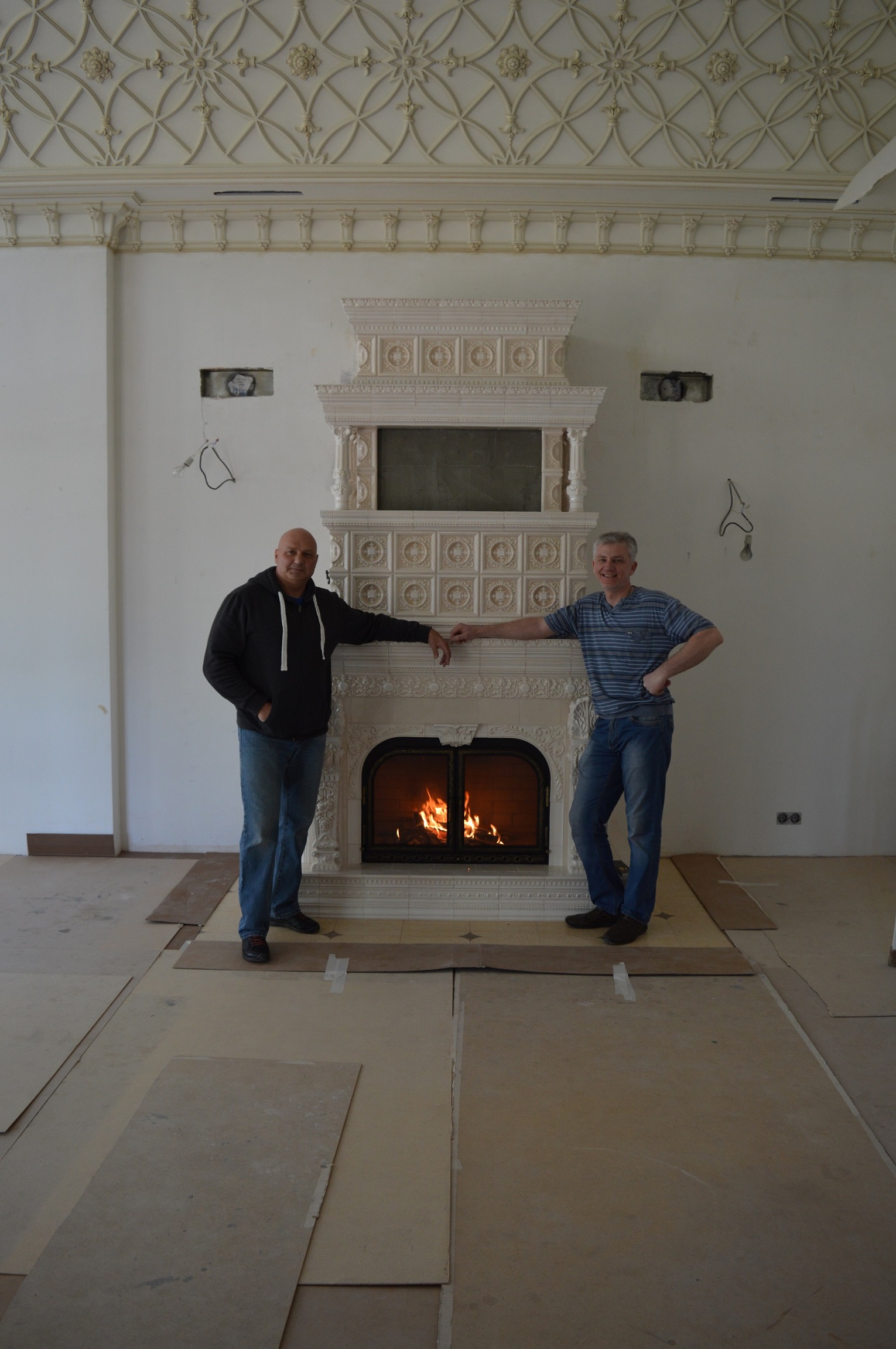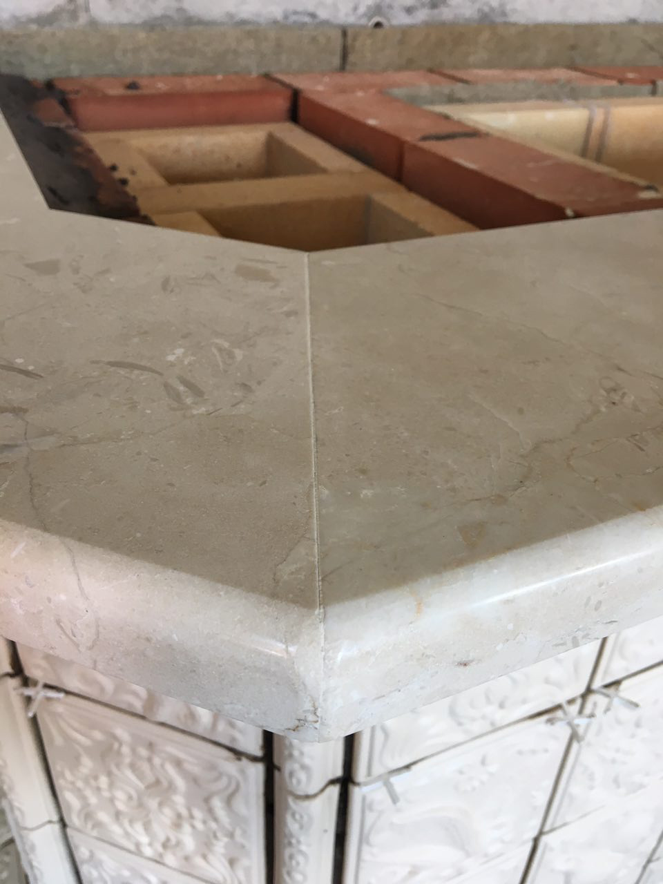 Полки на печках разные, одну мастерили из изразцовых элементов, а другая получилась мраморная.