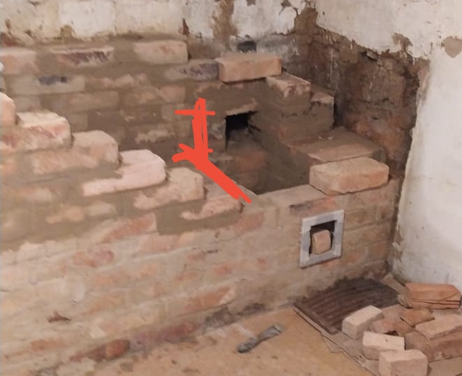 Изначально в печи было это отверстие, но когда прогорела духовка, этот вход заложили, и полностью засыпали кирпичами область где была духовка, вот тогда и появилось то большое отверстие