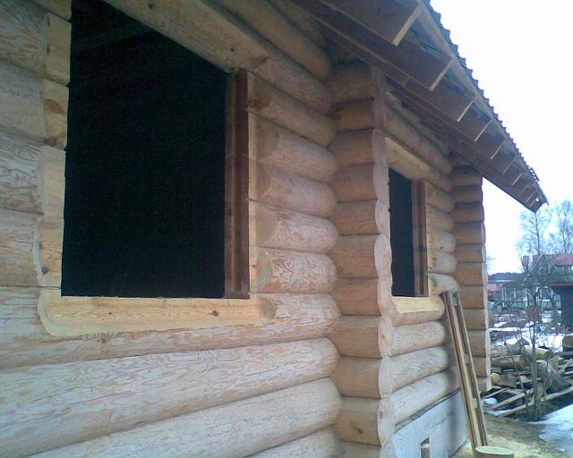 По поводу стен, в которых проемы. Тут все просто. Это классическая рубка "в чашу". В верхнем бревне выбран паз для нижнего бревна, так они прекрасно держатся. Качество рубки очень высокое, да еще сверху фронтоны давят как надо. В оконных и дверных проемах сделан вертикальный паз в который вставляется брусок к которому крепится дверная или оконная коробка.Этот брусок тоже добавляет прочности. Т.ч. за эти стены можно не переживать.