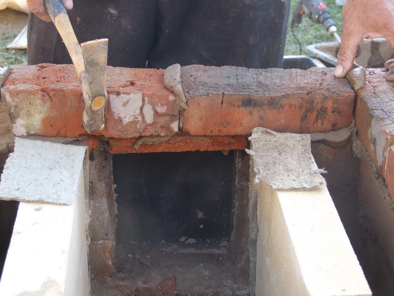 | расклад "на сухую" перекрытия топливника. Если казан большего размера, чем в нашем случае, можно подпилить кирпич до стенок |