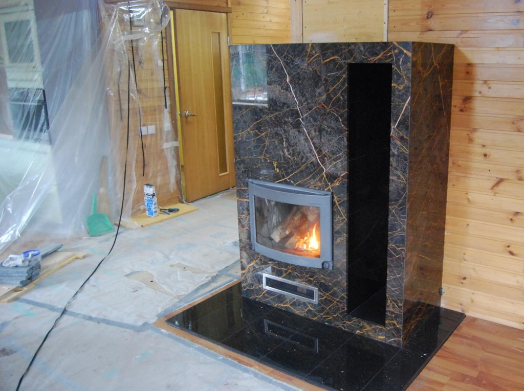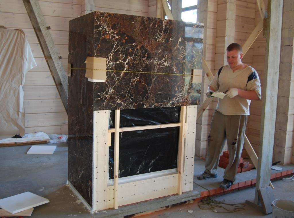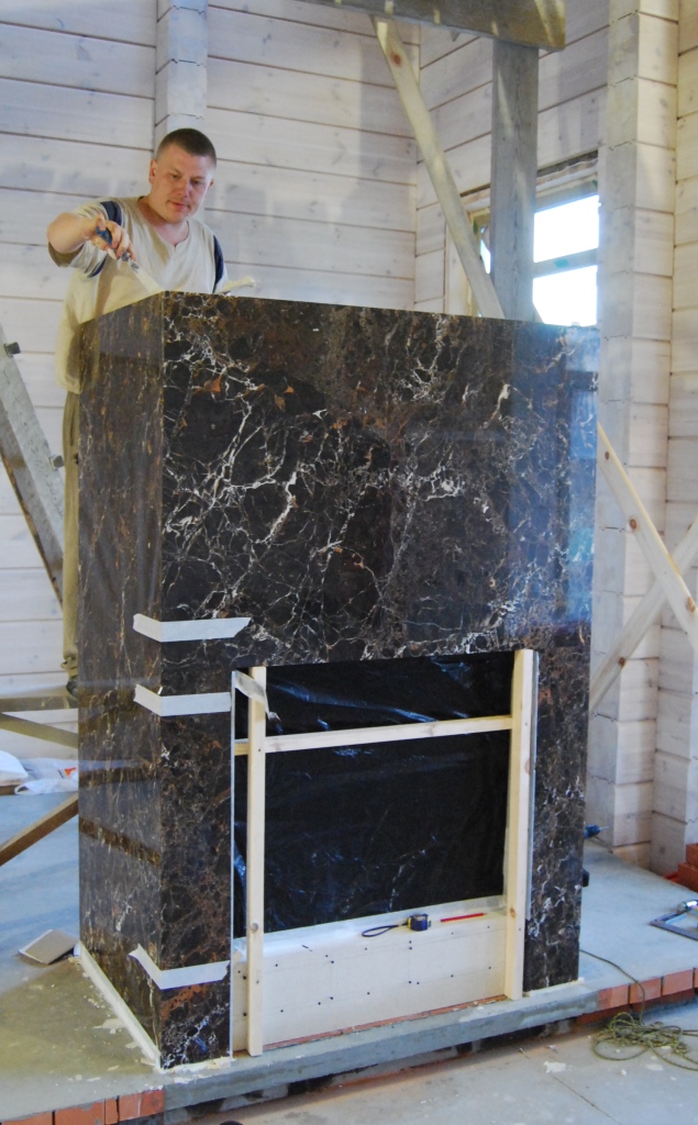 Привет Сергей, вроде даже от этого кожуха можно и рукава протянуть для подачи горячего воздуха в комнаты если нужно для этого. А мрамор как будете цеплять на гипсокартон на крючки?