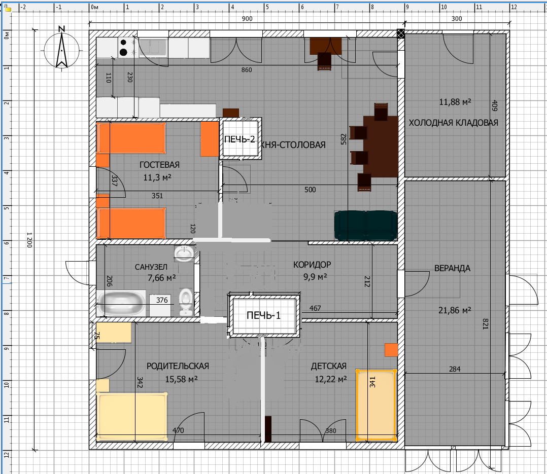 Планировка сама по себе неудачная, тем более под печное отопление.