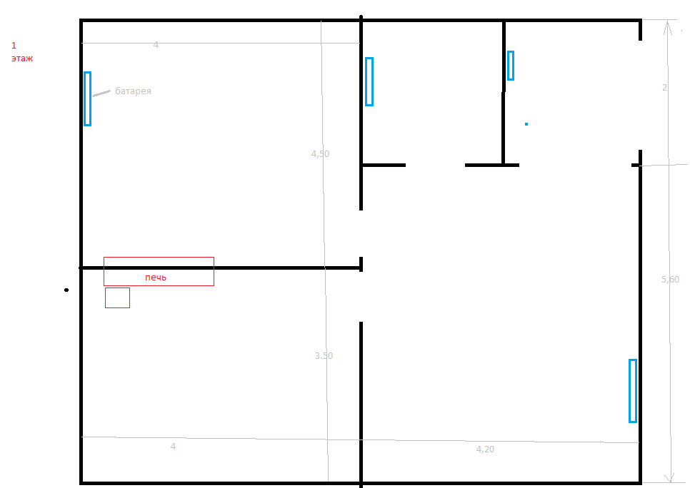 Я понимаю, что мы подгоняем под готовое решение. Что бы сделал я. Поставил котел на систему отопления разведенную по всему дому (рис). Что то мне подсказывает, что такой котел был бы более компактен и практичен, чем двухэтажная печь, да ещё и с котлом. Котел КИК работал бы на комнаты 1.5 и 2.3 и как печь и как котел. А остальные помещения он обогревал батареями.