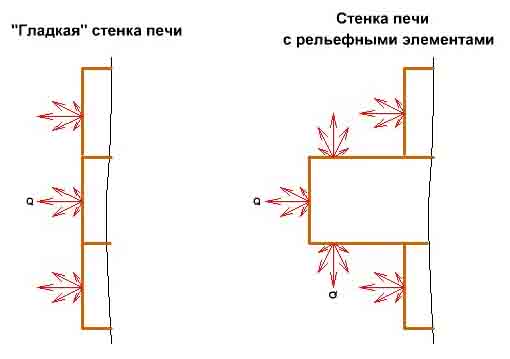 Из рисунка (ниже) видно, что "рельефные" элементы печи создают дополнительные поверхности излучения. Т.е. суммарная площадь излучения поверхности печи увеличивается на величину суммы площадей дополнительных поверхностей "рельефных" элементов стенок печи.