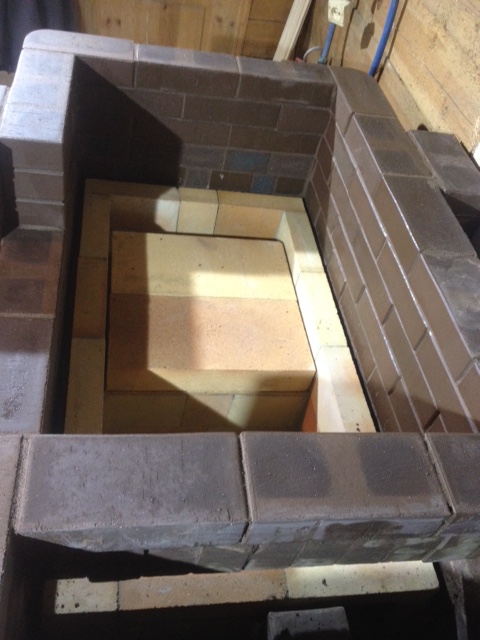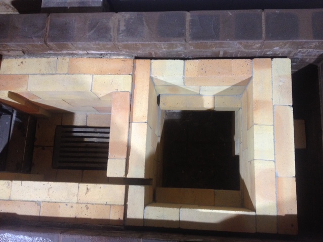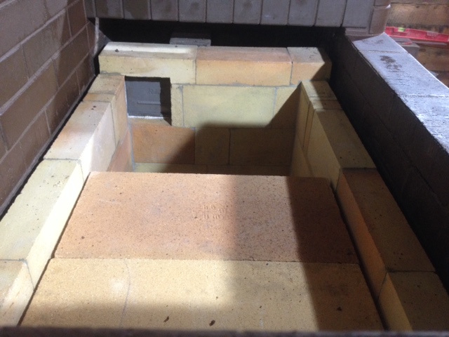 Подняли кладку выше топку перекрыли на 12 ряду плитами ш-94 спереди оставили горелку 10 см в ширину 38 см . В щитке поставили задвижку прямого хода на ребро протащили ручку шток в кирпичах через вату сверху положили балку .
