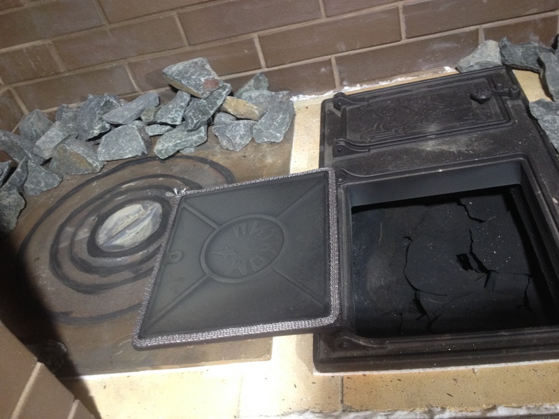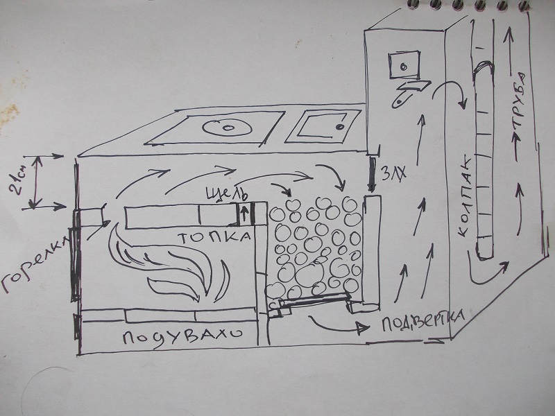 Плита и дверка снимают много тепла в дымовых газов идущих в каменку -камни трудновато будет прожечь от сажи и из-за этих теплопотерь и в топке не будет создаваться достаточно высокой температуры сжигания. Нужно создать условия в топке такие -чтобы в конце протопки дымовые газы выходили из топки с температурой не меньше 600гр. - для выжигания сажи на камнях. Ведь сразу же за перевалом падение температуры резкое градусов на 200 падение а внижней части каменной закладки и на 300гр падение. Сажа не выгорит.