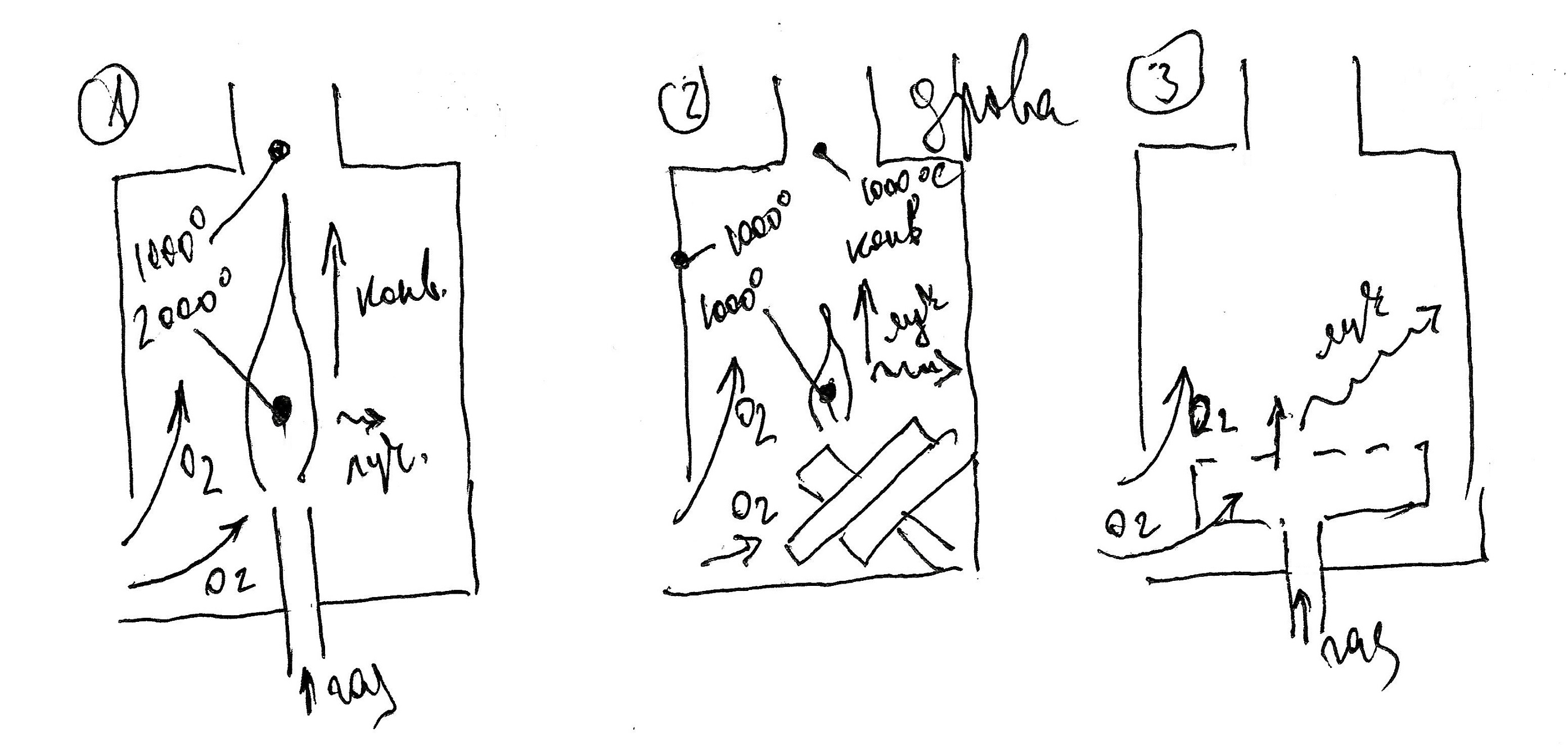 Рис.1. Давайте получим эти газы пиролизом в каком-то аппарате и подадим эти газы в топку. Пламя сразу уйдет в хайло, вынося конвективное тепло. И лишь чуть-чуть тепла пойдет на стенки лучистым теплом, топка холодная. При альфа два пламя дает условно 2000град, смешивается с таким же количеством "балластного" (избыточного) холодного окислителя, в результате в хайле 1000град.