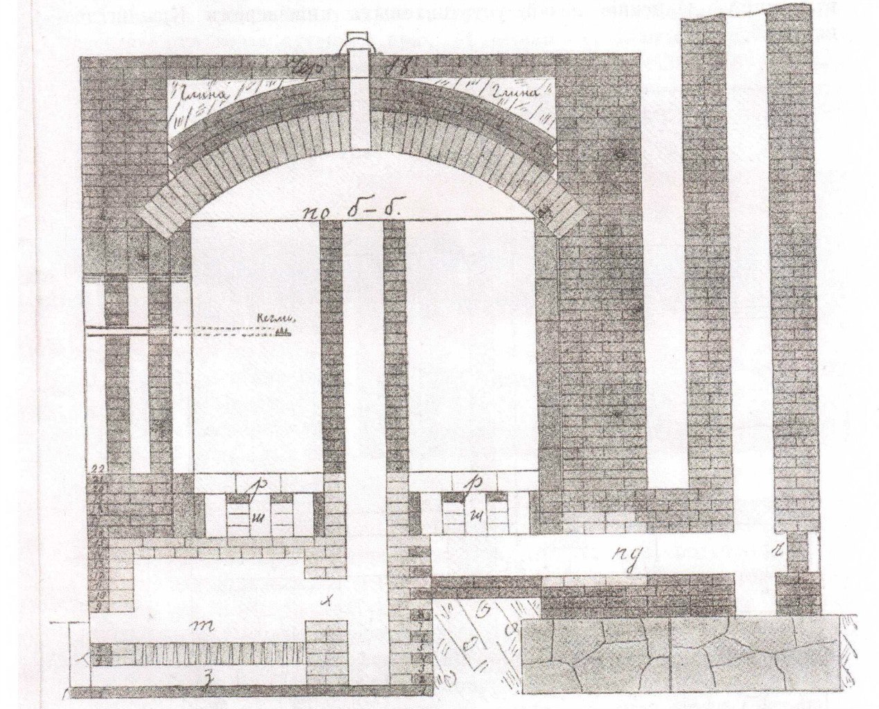 Я и не фотографировал, потому что получилось плохо. Я делал дымоход внутри нижнего свода, в задней стенке канал с подвёрткой. Дымоотвод в верхнем своде, как у Чернова, я не захотел - надо было пламенный поток завернуть внутрь закладки. Свод получился толстый, многорядный, горелки более длинные. На верхнем своде собиралась сажа. Главный вопрос, который остался нерешённым - как снять весовую нагрузку с нижнего свода. Он лучковый, а другого там и не сделать, у меня он вышел в 4 ряда, в стены давит своим весом дай боже как, а на него ещё и закладку класть. Бандаж из уголка там уже не спасёт, по-моему. Чернов всё-таки делал какую-то духовку, не предполагая так нагружать свод. Ну и в закладке надо чугунные болванки класть, всё остальное рано или поздно забьёт горелки.