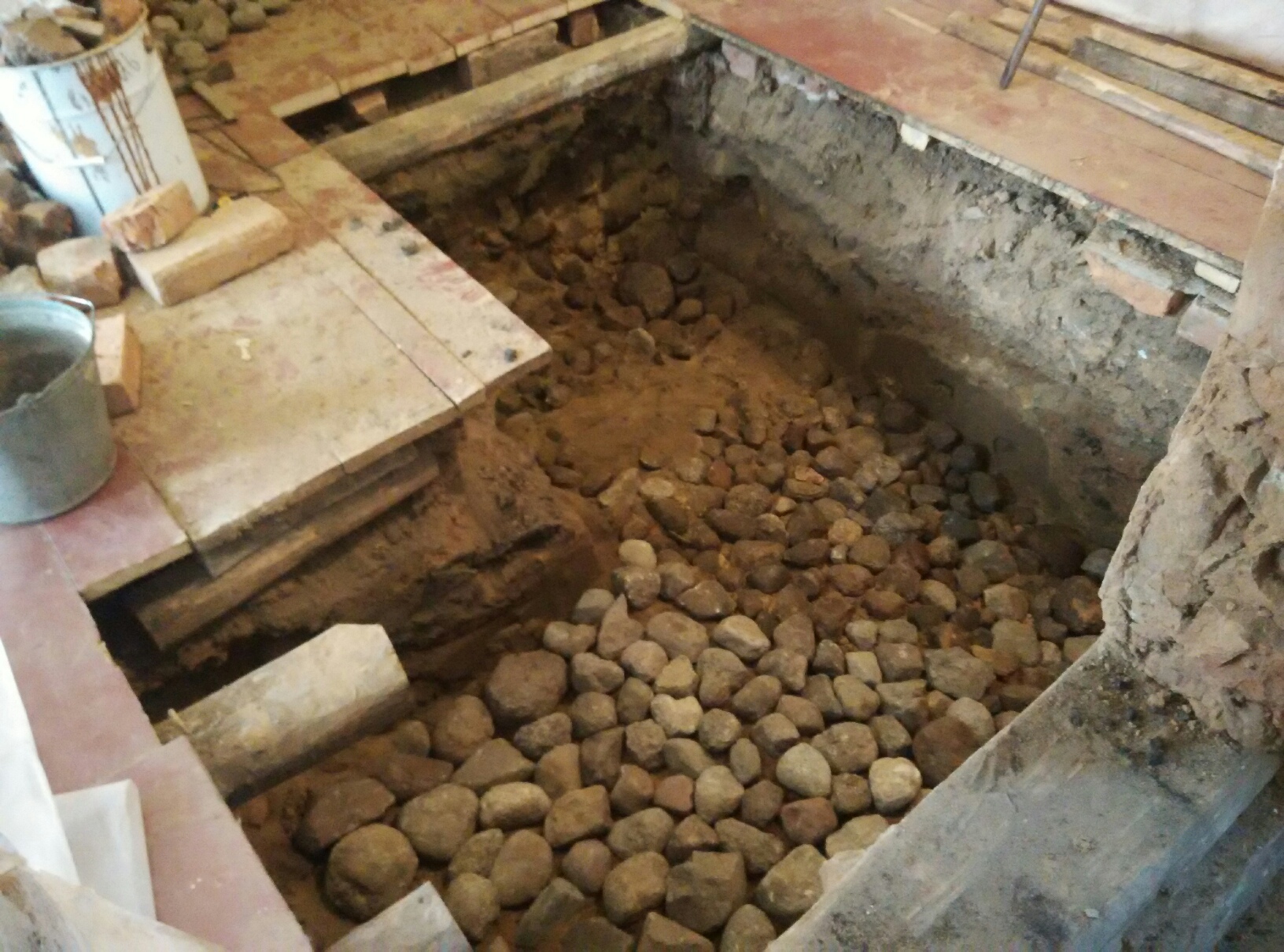 Прошло уже больше года, как сделан проект, и вот я все же добрался до строительства. Всей семьей разобрали старую печь, а дальше выкопал котлован около 70см, на дно уложил булыжники, затем засыпал песком, снова булыжники, песок... Трамбовал, поливал водой. И так до сантиметров 40. А наверх бетонную стяжку около 30см. Бетон старался сделать м300 - ориентировался на таблицу на мешке.