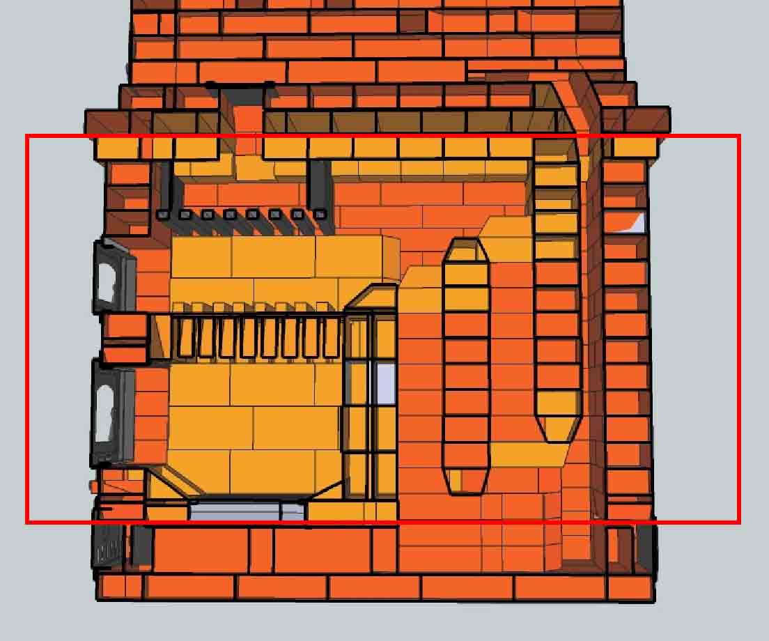 Ну и, подытожив выше сказанное, на общем плане нижнего яруса (Рис.5) я указал область кирпичной кладки из керамического кирпича, которая и вызывает у меня вопросы. Нагреваться данная область будет не меньше перекрыши нижнего яруса. Но перекрыша из шамота, а данная область из керамики. ???