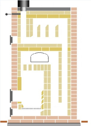 Из шамота только только верхние и нижние кирпичи рассечек, т.к. это наиболее горячие места в печи (кроме стенок топки). А боковые стенки нефутерованы для более быстрого прогрева и лучшего прогрева - чтобы нагреть шамот, нужно тоже затратить энергию, а где нет огня (в каналах н-р) много энергии, что сильно сказывается на расходе дров. К тому же с футеровкой не получится четыре опускных.