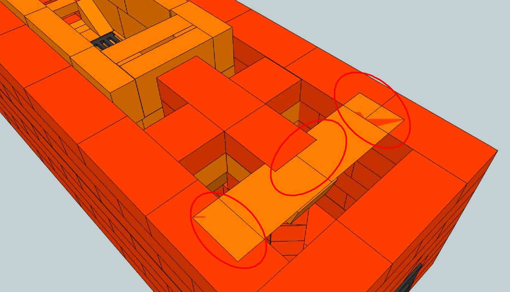 Рис.4 – красными овалами я указал, для примера, области максимального нагрева переходов. "Область 1" не вызывает вопросов, а вот "Области 2 и 3" вызывают. Почему они сформированы кирпичами разного типа? Это вопрос, который я задаю себе и не нахожу ответа.
