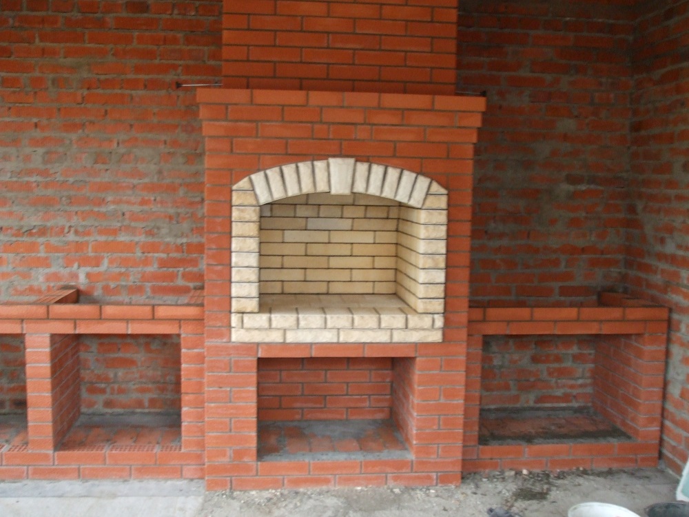 Я тоже строю такого же типа несложные мангалы с печками под казан. Вот фото. Можете критиковать. Мангал без зуба. Труба в шестерик с гильзой 250 мм. Кладка облицовочного кирпича не цементно-песчанном растворе. Поэтому топочную дверцу печи под казан креплю на шамотную футеровку. Работаю с подсобником.