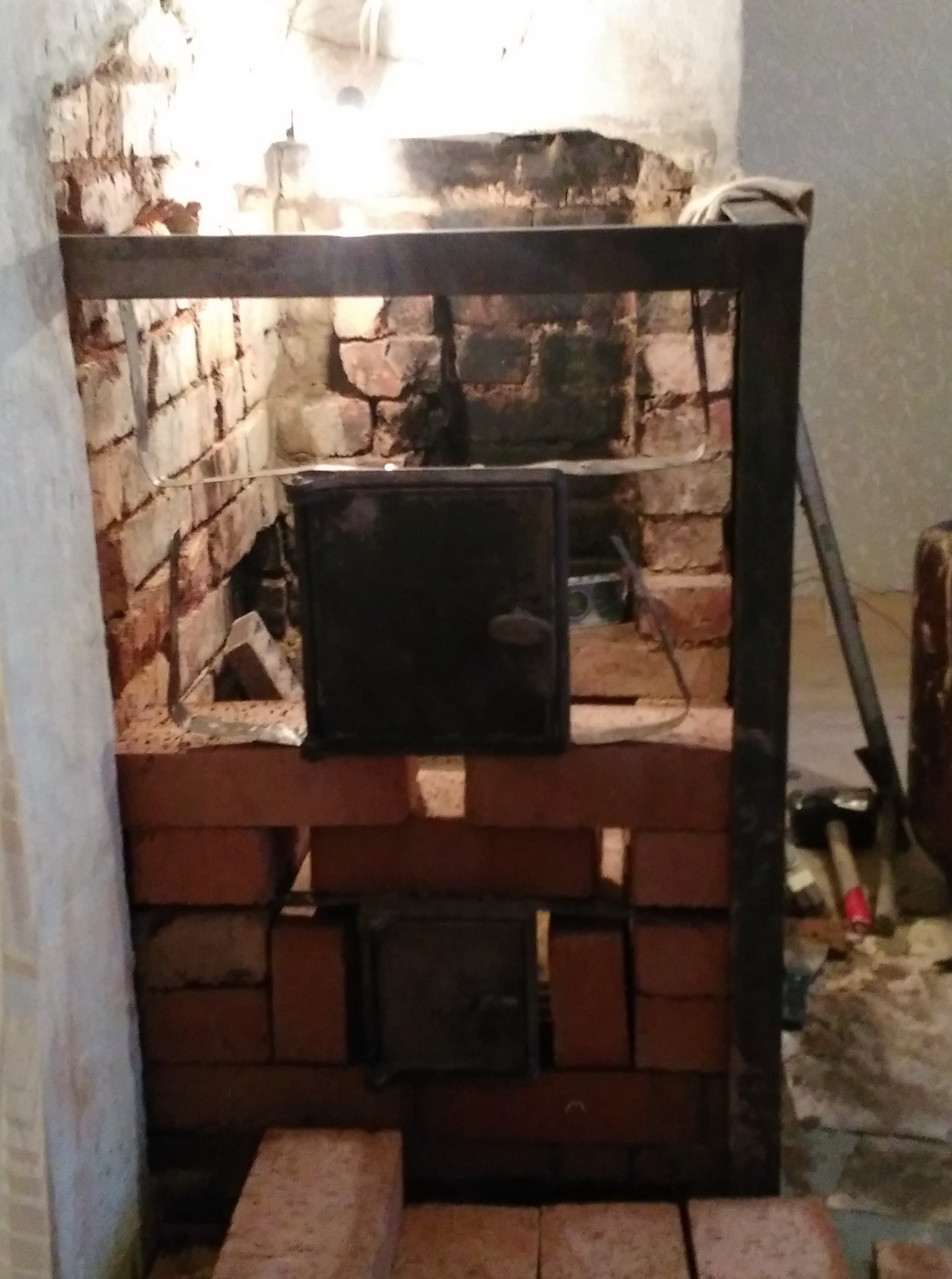 2. вытащил заглушку ЗЛХ из 2-го канала и­ вмуровал её в 1-м канале чуть выше с об­ратной стороны дымохода (иначе бы заглуш­ка при открытии упиралась в стену слева ­от печи);