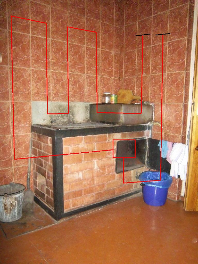 При разборе убрал плиту (уже купил новую такую же 41*71 см), кирпичи над ней, духовку и лежащие на ней кирпичи; планирую переставить топочную и поддувальную дверцы с торца, выложить по контуру новый керамический кирпич с самого фундамента без духовки. Однако ... столкнулся с проблемой ввода в дымоход. Причем, я просто не вижу как сделать вывод на имеющийся дымоход...