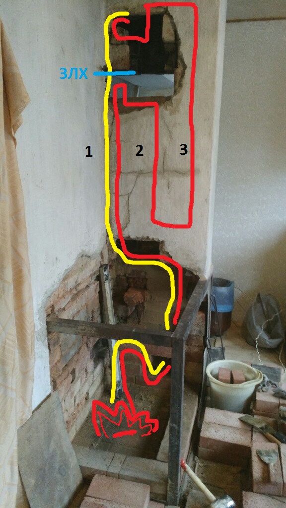 2. вытащив кирпичи за ЗЛХ обнаружил что ­канал 3 упирался в своеобразный колпак. ­Решил воспользоваться этим, соединив кан­алы 2 и 3 внизу (сделаю короб из листа н­ерж – чтобы ДГ, поднимающиеся по каналу ­из хайла быстро нагревали нерж короб, а ­вместе с ним и воздух в каналах 2 и 3).