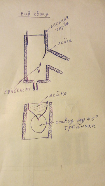 Читал здесь у Вас Владимир что пятерик можно заменить на сендвич 150мм. На 120мм. страшновато. Там ещё место есть одно в сендвиче которое меня смущает.От конденсатосборника труба уходит под 45-ть градусов в сторону, так как можно сделать чтобы чтобы конденсат из труб между конденсатосборником и грибком по наклонному участку не попадал в печку?Думаю сделать что-то вроде лейки чтобы она собирала конденсат над отводом в сторону печки как на фото, она вставляется между тройником и верхней трубой. Или есть варианты получше?