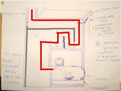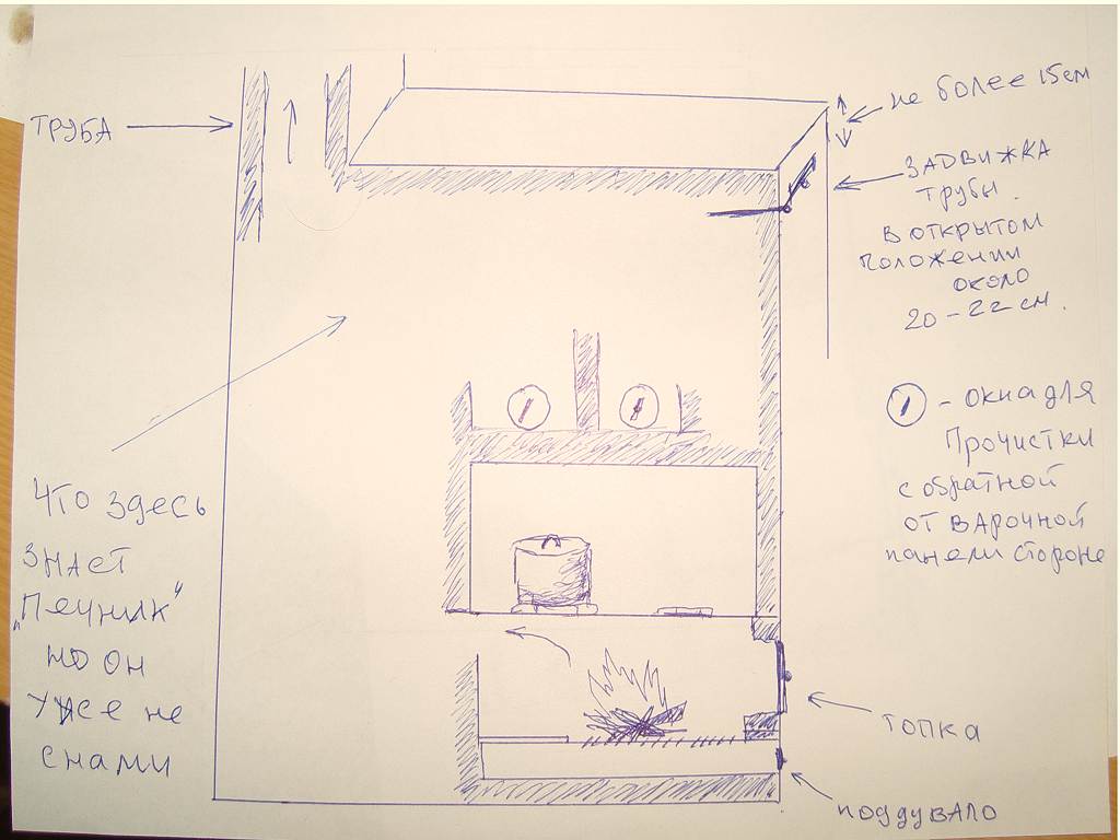 Столкнулся со следующей проблемой. На даче стоит печка уже лет 25. Топится отлично, правда начала немного сыпаться у топочной дверцы, но там сгорели кирпичи. Основная проблема в том, что из трубы идёт черный дым не зависимо от того какими дровами топится. Топил чистой берёзой без бересты, сосной, ёлкой. При растопке дым серенький, а когда дрова разгораются, натурально черный, густой дым. Труба чистая, на стенках нет даже миллиметра сажи. В печке есть два прочистных окна, там тоже регулярно чищу и сажи за год не более 150 гр. Как устроены каналы внутри печки представляю себе слабо, а вернее очень хреновенько представляю. Вот набросал по памяти эскизик. Размеры относительные, но общий принцип надеюсь понятен. Я это всё к тому, что у меня появилась мысль, а не горит ли где-нибудь в каналах сажа, хотя горящей сажей, при топке, дым не пахнет. Знаю, что ещё печники оставляют по кирпичику для чистки каналов, но на печке похожего не нашел. А может просто бывшие хозяева капитально заштукатурили и ни чего не видно. Не могли бы вы намётанным глазом предположить как устроены каналы в этой печке? Особенно меня убивает расположение задвижки. Фото до весны нет, дача далеко, в тайге. Возможно причина черного дыма и не в дымоходе, а в кислороде, но в этом деле я, ребята, не считаю себя профи. Помогите кто чем может!
