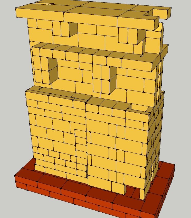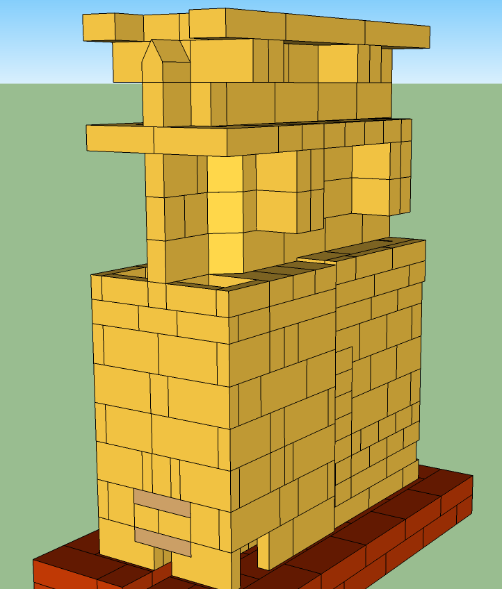 Представляю на обсуждение печь с калориферным каналом теле печи(внутри шамотного сердечника).Калориферный канал на проекте без изоляции для газоплотности жестяным коробом. Для герметизации в кирпичах пазы и проложены ламели из нержавеющих пластин. Данный проект предоставляется как тех.решение без технических тонкостей для самостоятельной кладки.