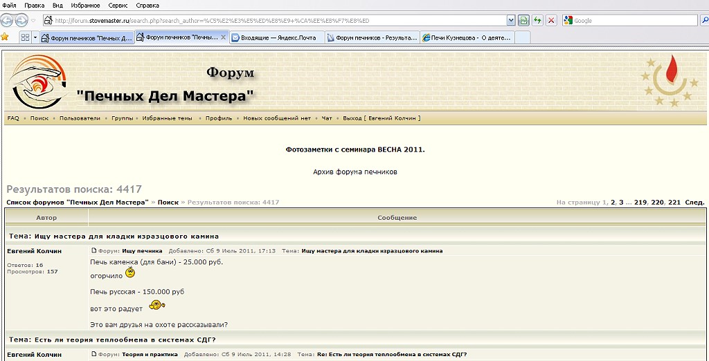 пример - попробуйте найти все сообщения пользователя - щелкните на фразе "Найти все сообщения пользователя Евгений Колчин"