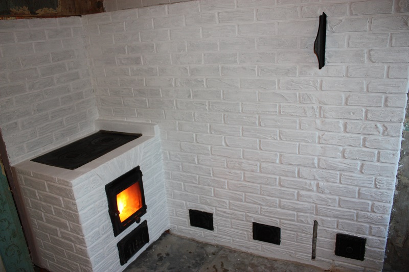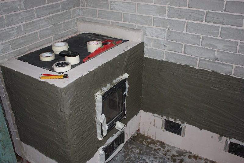 3. Плиточный термостойкий клей для печей Терракот+Термостойкая штукатурка плитонит. Третий вариант оказался самый говняный. Думал в напряжённых местах будет самый надёжный...стенки печи(кое где)когда давал перетоп были около 120 градусов--полёт нормальный всё держит...а вот по периметру примыкания дверки стал осыпаться 2-3 мм. (потом плиткой клинкерной буду выводить другой рисунок)